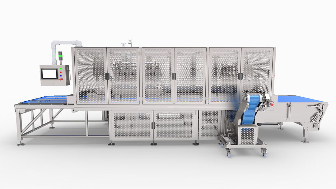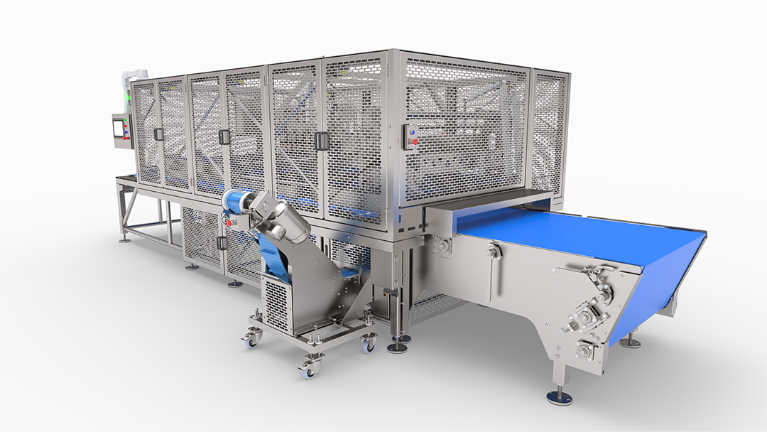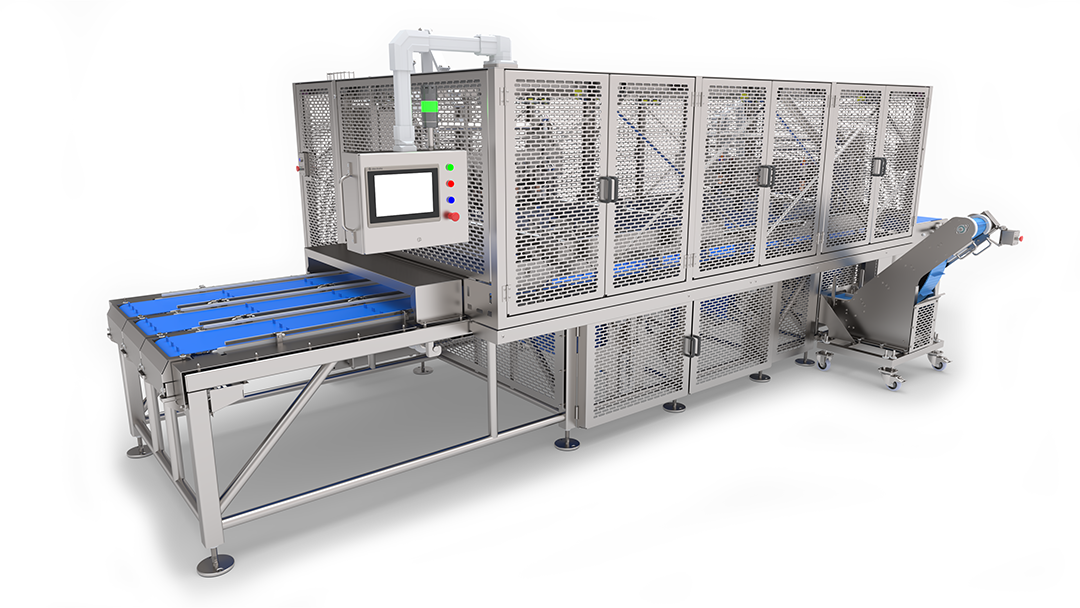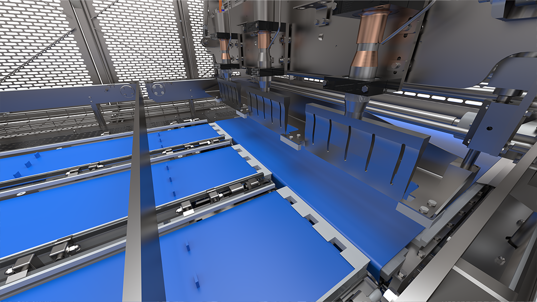 At the entrance of the cutter, there are 3 conveyor belts equipped with cleats and side rails to locate the products.